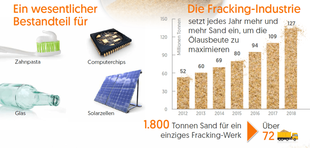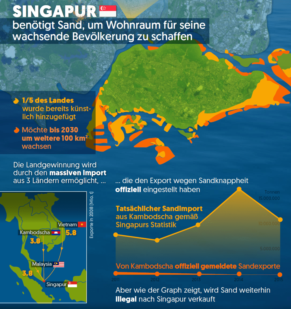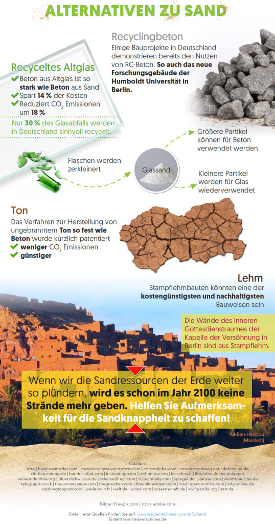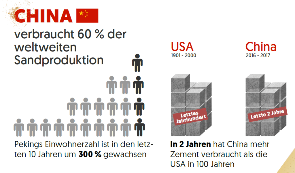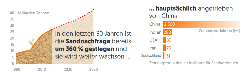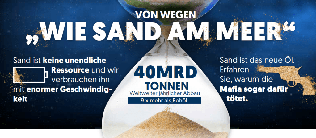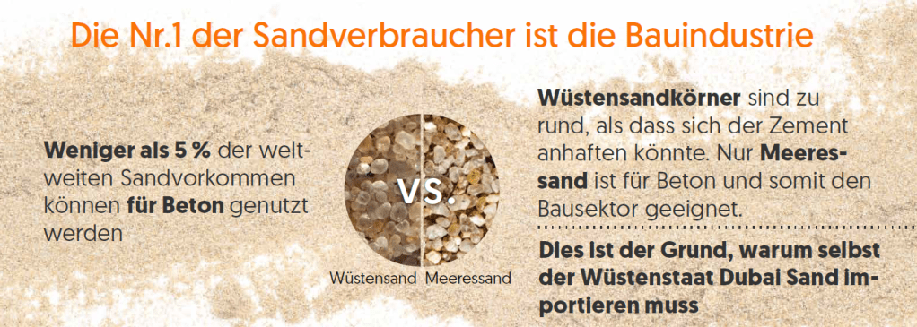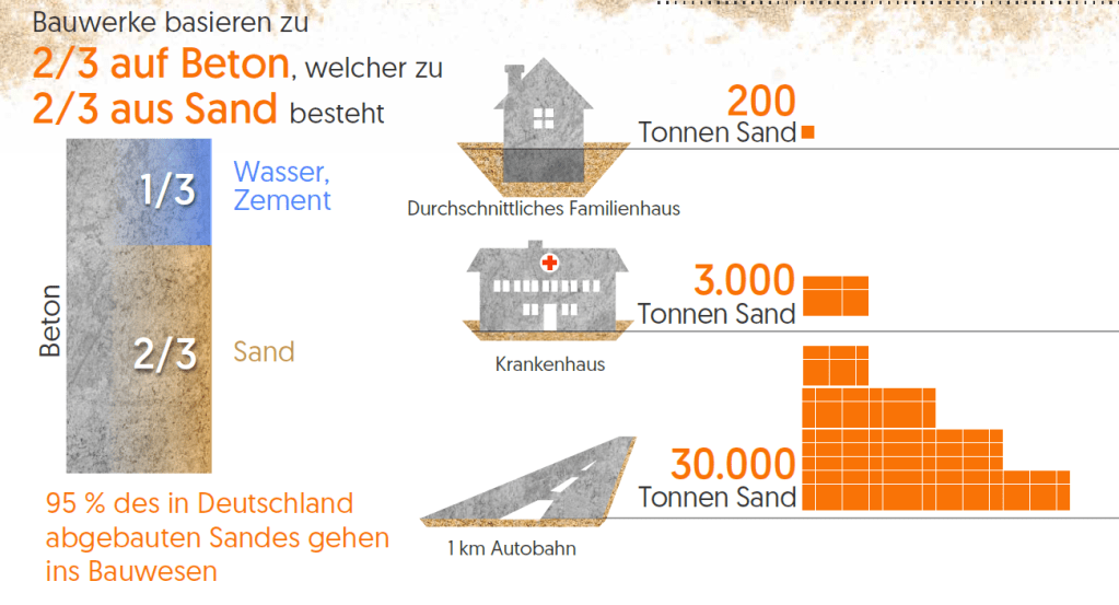 Einige Zahlen: Beton besteht zu einem Drittel aus Zement und zu zwei Dritteln aus Sand. In einem Einfamilienhaus stecken über 100 Tonnen Sand, in einer Schule 1.000 Tonnen, in jedem Kilometer Autobahn 10.000 Tonnen und in einem Atomkraftwerk mehr als 10.000.000 Tonnen. Und Sand steckt in Glas, Putzmitteln, Zahnpasta, Mobiltelefonen, Solarzellen, Mikrochips, Papier, Kosmetika, Plastik für Flugzeuge… die Liste ist noch viel länger. Sand ist -nach Wasser- der wichtigste Rohstoff der Menschheit. Und er wird, kaum zu glauben, knapp, aber bisher kümmert es niemanden. Die Bauwirtschaft hat deshalb Sand vom Meeresboden ins Visier genommen. Dies ist nicht nur eine ökologische Zeitbombe, auch der Küstenschutz braucht Sand. Dabei gibt es Alternativen zum enormen Sandverbrauch der Bauindustrie. Deutschland ist dabei führend, 90% des Abbruchmaterials werden hierzulande verwendet, 66 Millionen Tonnen/Jahr.