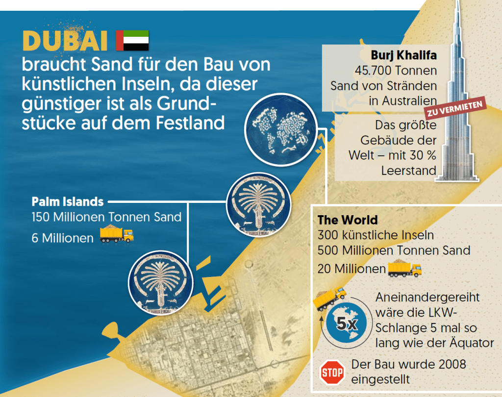 Wir stehen am Rhein. Schwer beladene Schubschiffe sind unterwegs. Sie haben Sand geladen, Sand aus dem Rhein. Bestimmungsort: Dubai. Wir können nicht recht glauben, dass es so ist. Aber ohne die gewaltigen Sandimporte aus Australien, Deutschland und weiteren Ländern wären die Mega-Bauvorhaben in Dubai und in anderen arabischen Ländern nicht realisierbar. Das derzeit höchste Gebäude in Dubai, das Burj Khalifa mit der luftigen Höhe von 828 Metern, enthält wahrscheinlich auch Sand aus dem Rhein.
